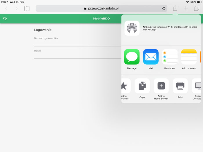 Klikamy ikonę ze strzałką u góry strony, która otworzy nam menu kontekstowe z którego wybieramy "Add to Home Screen" (Dodaj do ekranu).