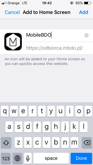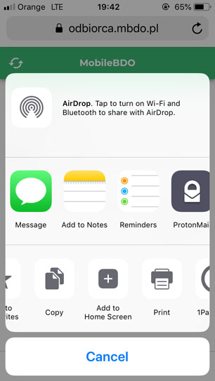 Klikamy ikonę ze strzałką u dołu strony, która otworzy nam menu kontekstowe z którego wybieramy "Add to Home Screen" (Dodaj do ekranu).