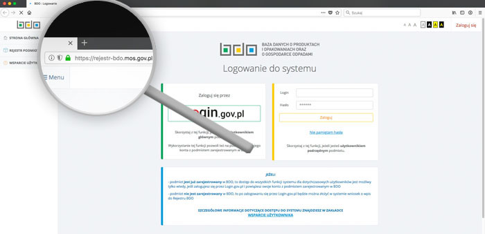 W pierwszym kroku otwieramy przeglądarkę internetową oraz logujemy się do BDO na stronie https://rejestr-bdo.mos.gov.pl/.