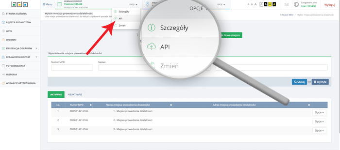 Na górze okna, koło wybranego podmiotu, jest przycisk o nazwie Opcje. Po kliknięciu w niego, otworzy się lista opcji z której wybieramy API.