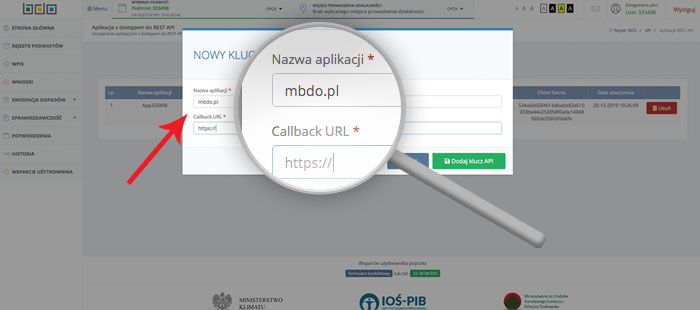 W oknie, które się otworzy, w polu Nazwa Aplikacji wpiszmy dowolną nazwę która pozwoli określić w przyszłości z jaką aplikacją mamy do czynienia, np: mbdo.pl oraz w polu Callback URL wpiszmy https://, po czym kliknijmy w przycisk Dodaj klucz API.