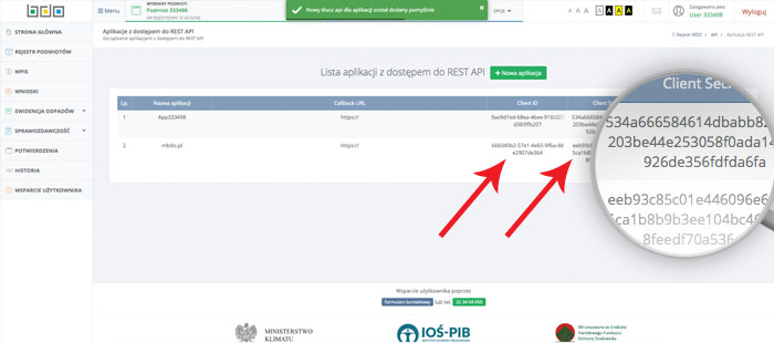 W kolumnach Client ID oraz Client Secret znajdują się dane, które trzeba będzie wprowadzić w ustawieniach aplikacji MobileBDO, aby sparować ją z Państwa kontem BDO.